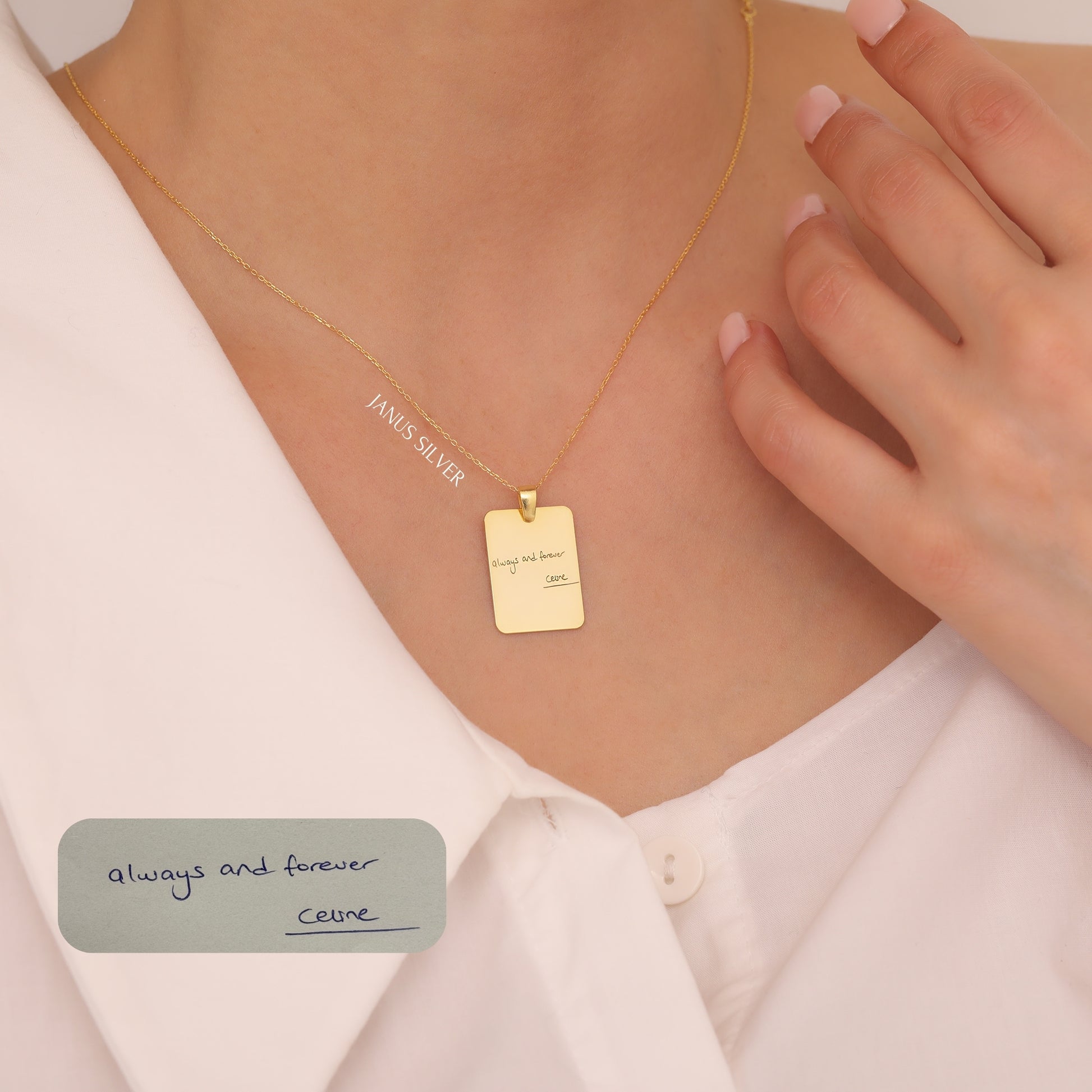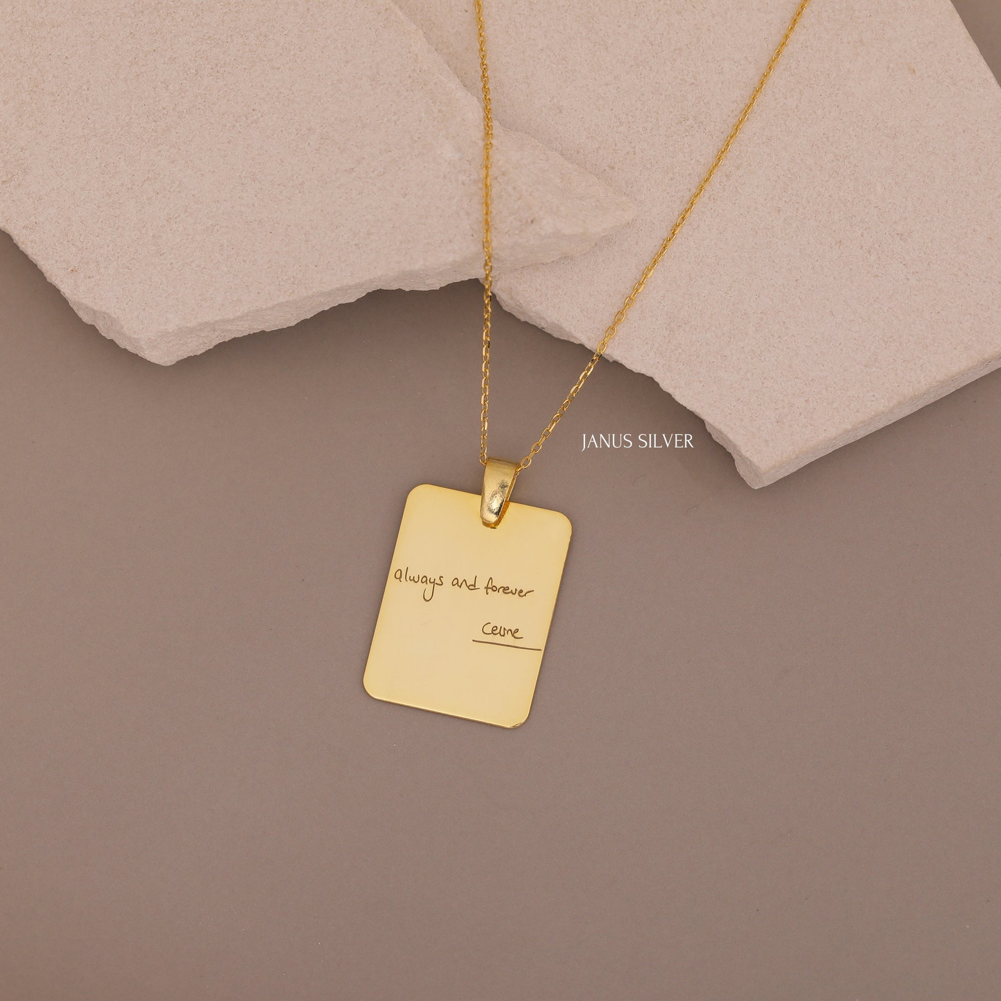 Capture your most cherished memories with our Custom Handwriting Necklace. This memorial gold engraved necklace is a truly personalized piece, featuring your own handwriting for a unique and sentimental touch. Wear your signature close to your heart with this one-of-a-kind jewelry. Truly special and meaningful gift to yourself or a loved one.