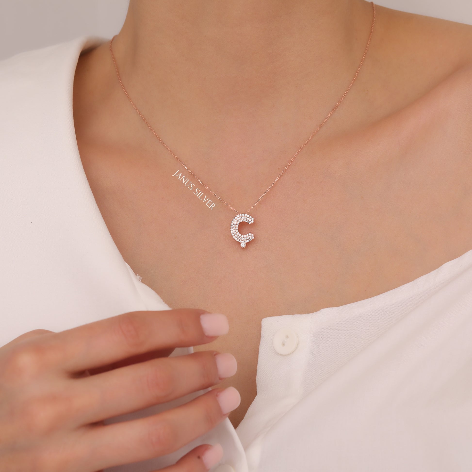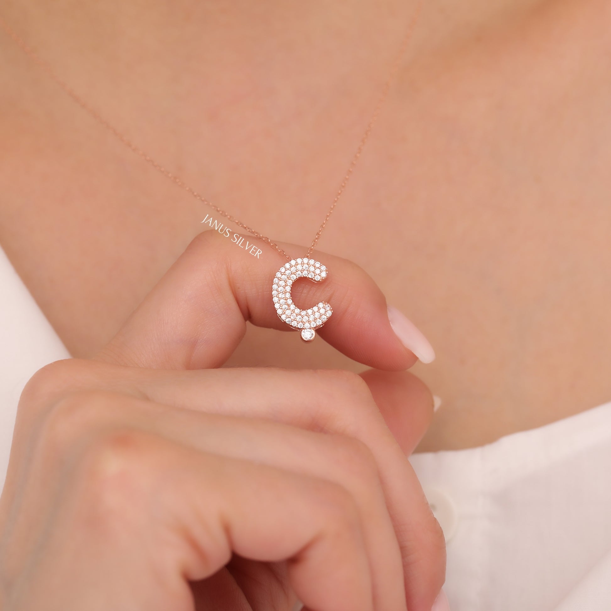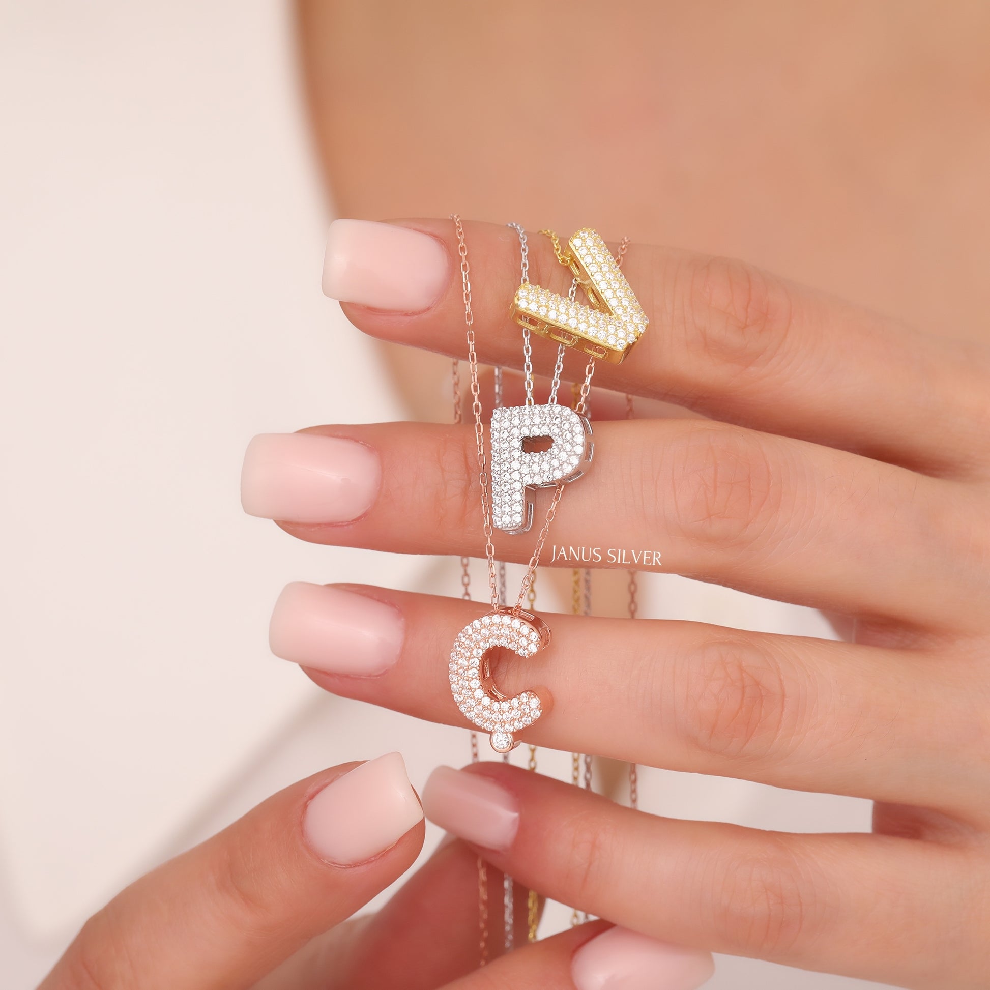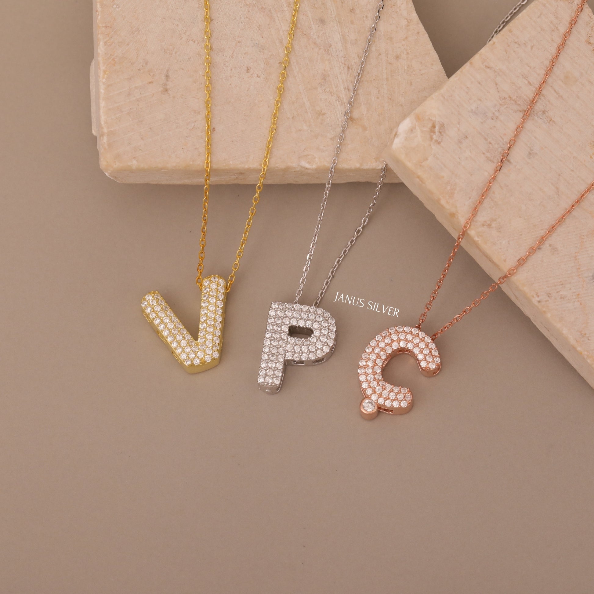 Custom Bubble Letter Necklace, Balloon Bubble Initial Necklace with Zircon Stone